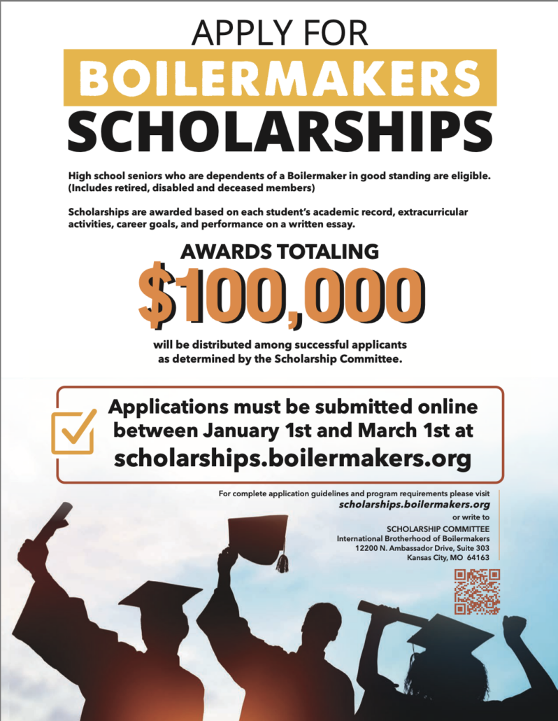 Dependents of Boilermaker members are eligible for scholarships of up to $5,000. Beginning in 2022, the International Brotherhood of Boilermakers awards up to $100,000 worth of scholarships to dependents of members, including those in Canada and the U.S.